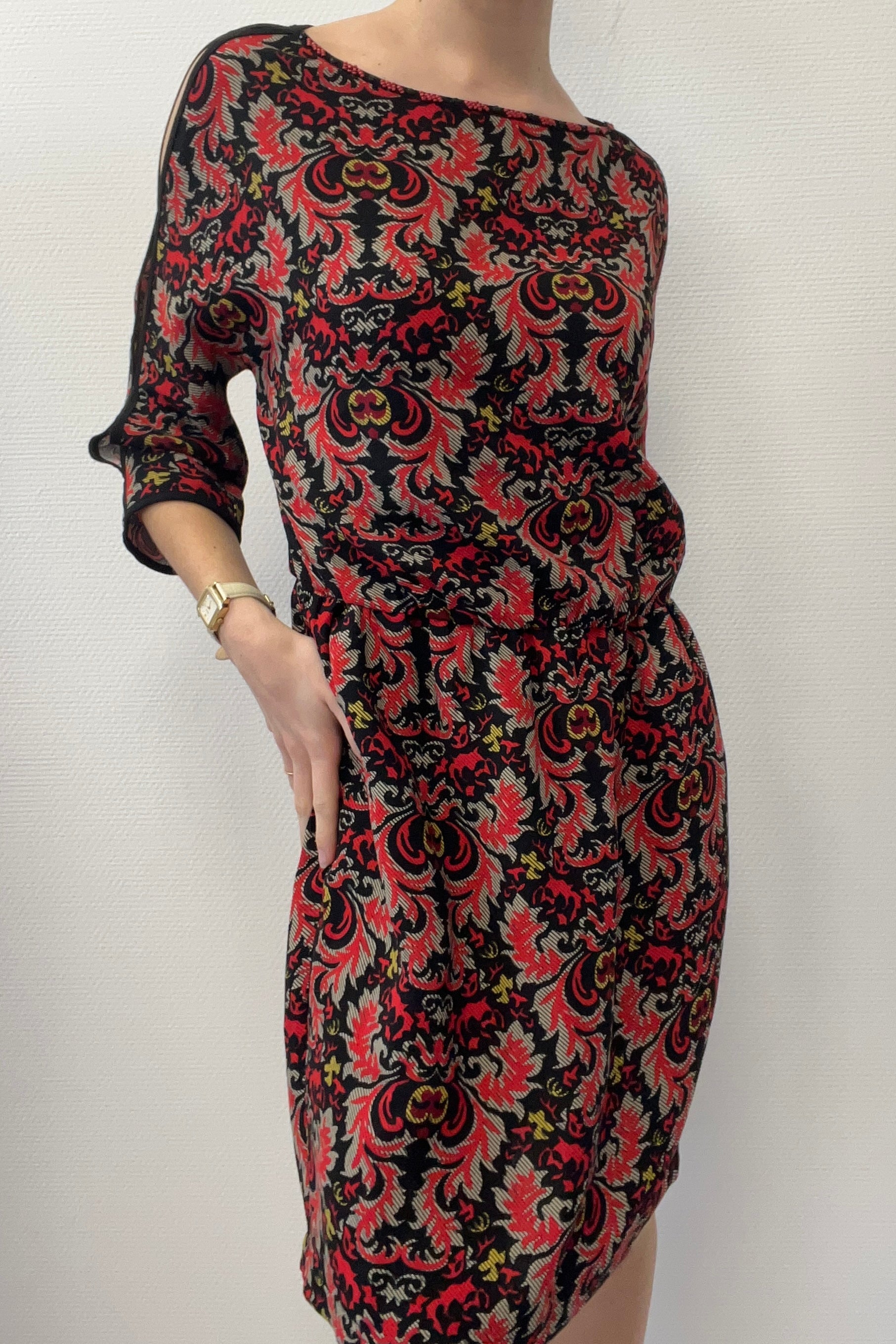 Cette robe aux motifs colorés avec élastique à la taille est idéale pour une journée ensoleillée. Avec ses manches ouvertes et son col orné de perles décoratives, elle apporte une touche d'élégance à votre tenue. Le motif aux tons rouges est un choix audacieux qui ajoutera du dynamisme à votre garde-robe.